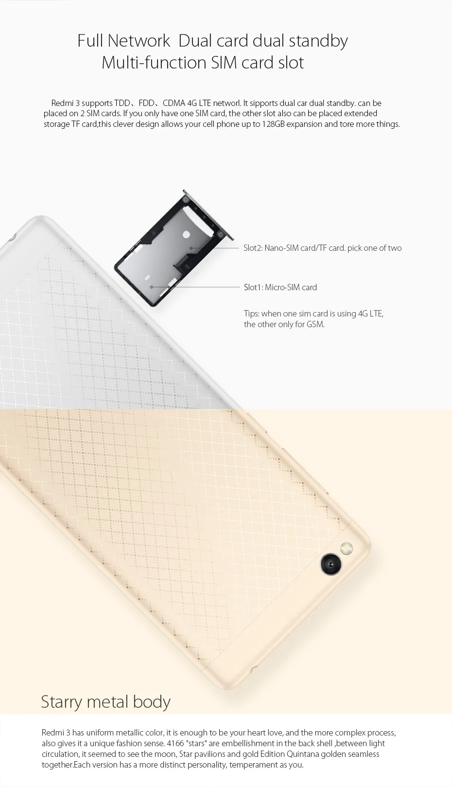 - Dual Sim Card Dual standby; Slot 1:Micro SIM Card; Slot 2:Nano-Card/TF Card; pick one of two(when one SIM card is using 4G LTE, the other only for GSM.)