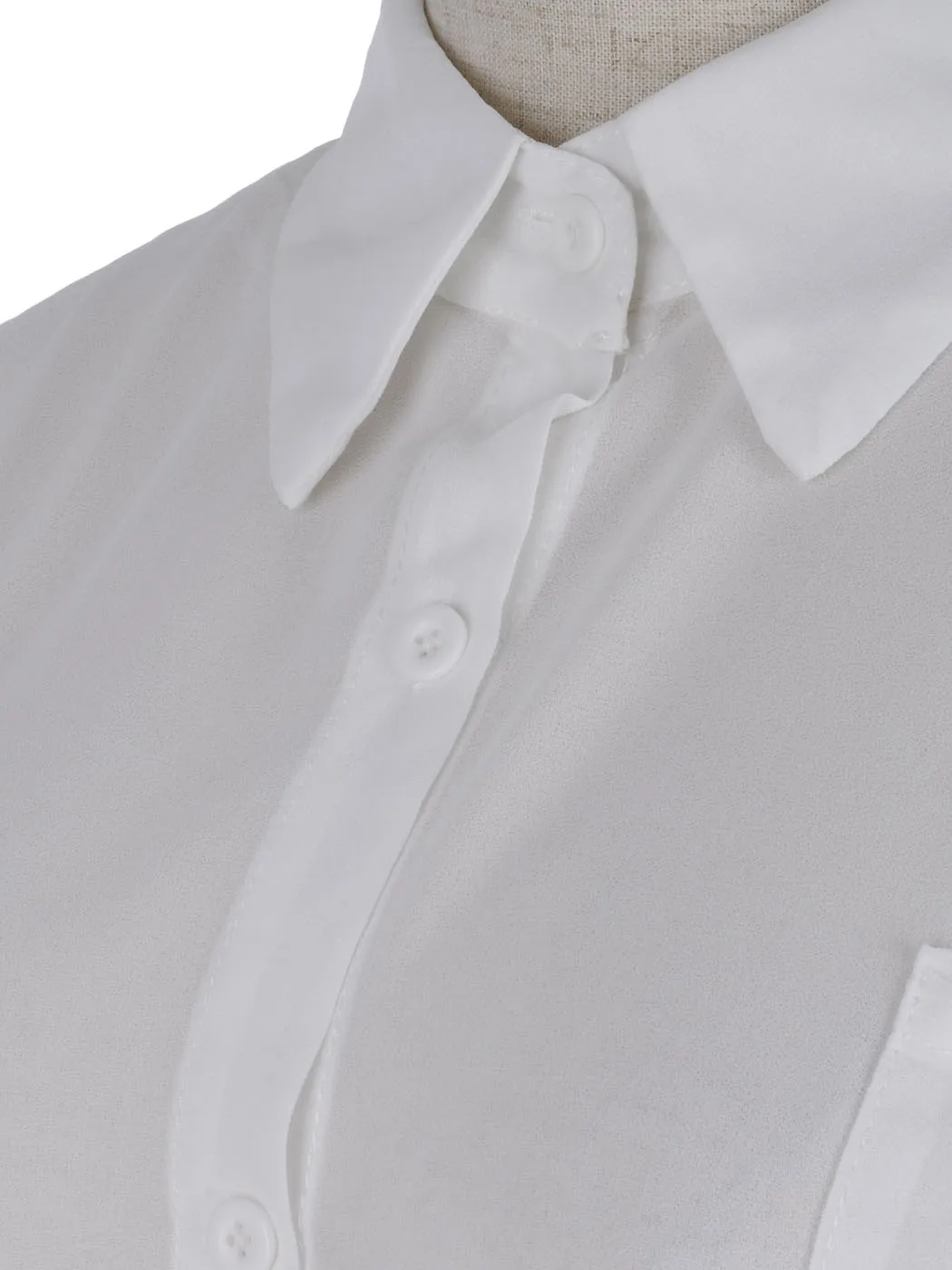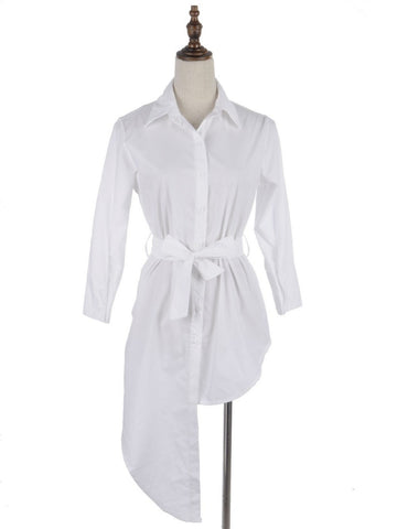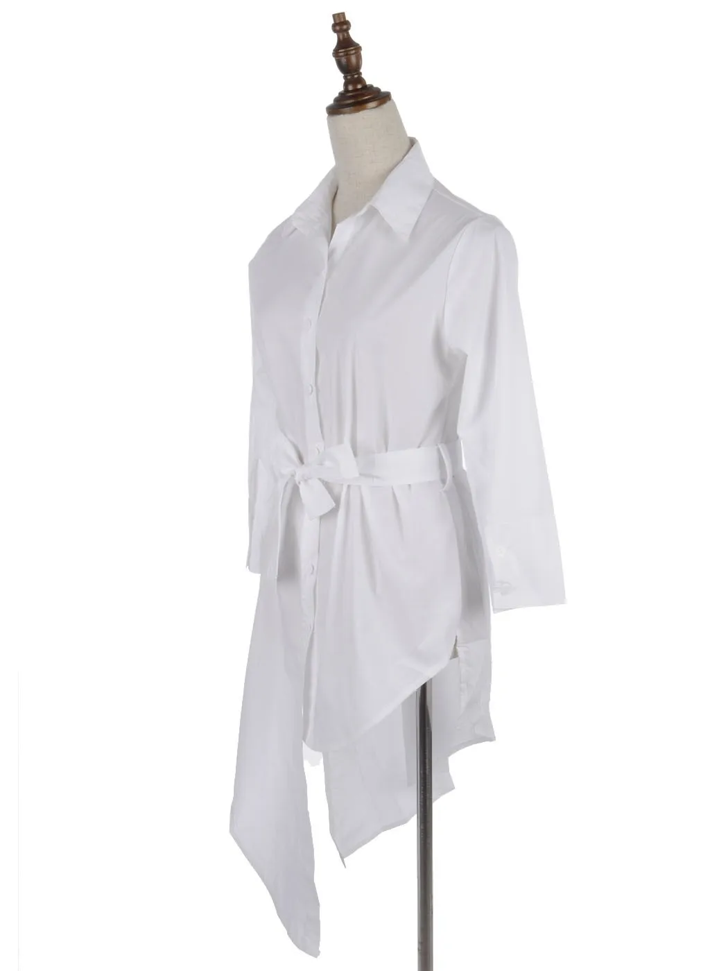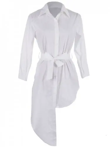 Women White Shirt Dress Long Sleeve Turn Down Collar Spiral Asymmetrical Tail Hem Tie Sash Waist Shirt Dresses